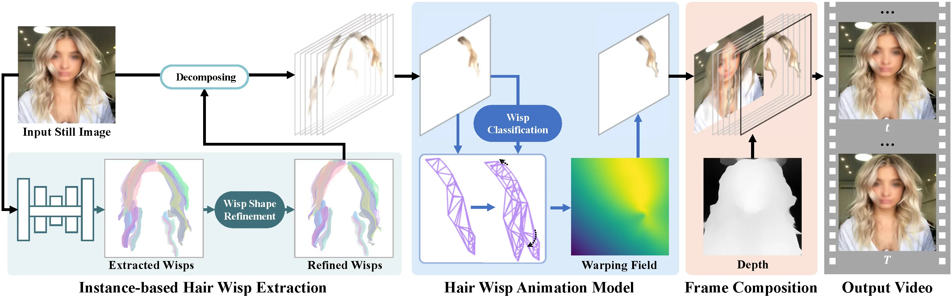 This work treats hair as many small wisps. It first finds these wisps, then animates each one, and blends everything into a short video. The goal is clean motion without odd flickers or warped faces.