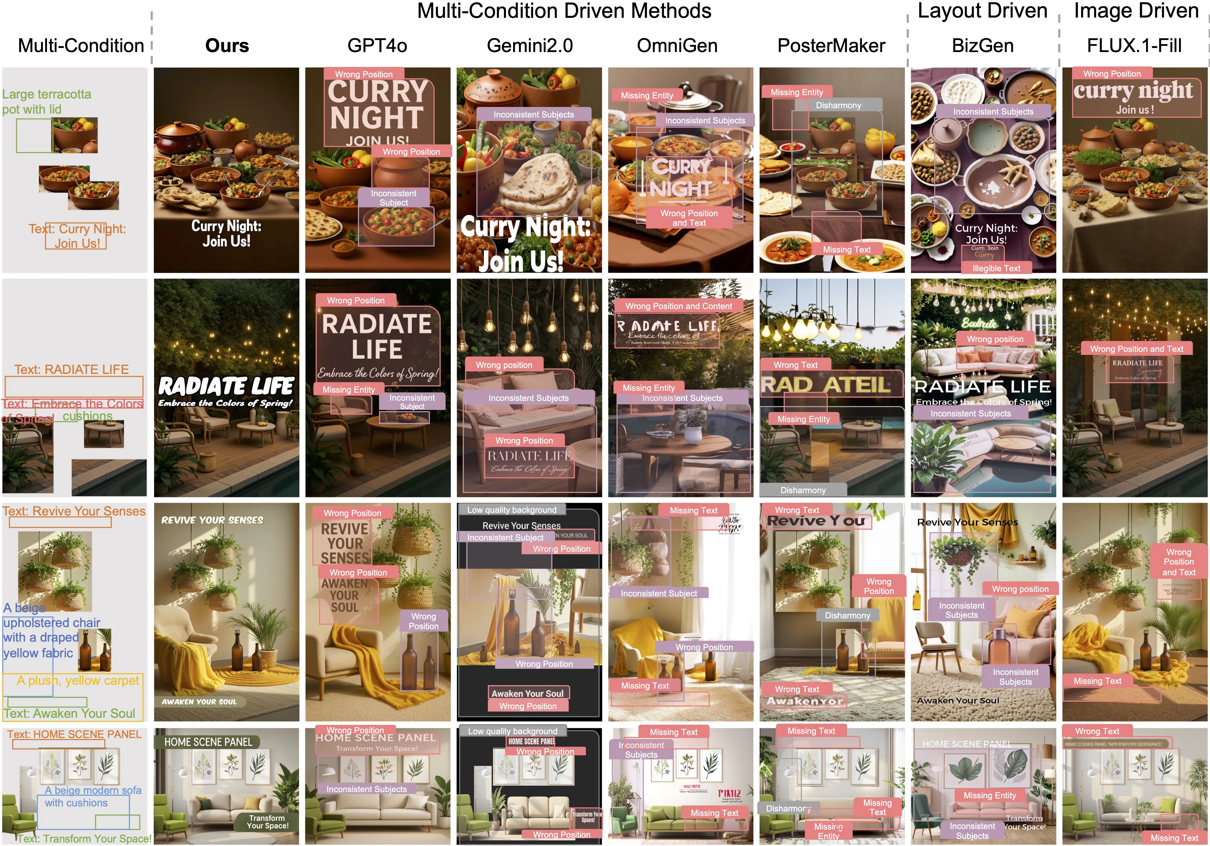 CreatiDesign shows stronger subject keeping and tighter layout match than prior single-condition and multi-condition baselines. It also holds text and decorations in their zones with fewer mistakes.