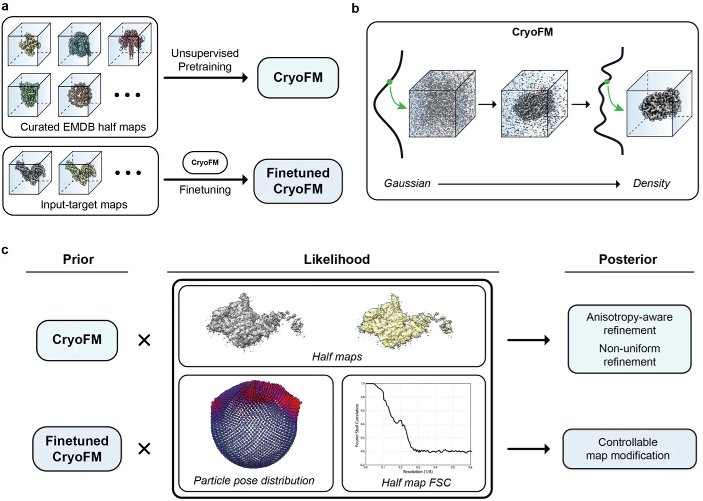 - CryoFM: A Flow‑based Foundation Model for Cryo‑EM Densities (Oct 15, 2024). Shows that flow‑matching can learn a prior over biomolecular density maps.