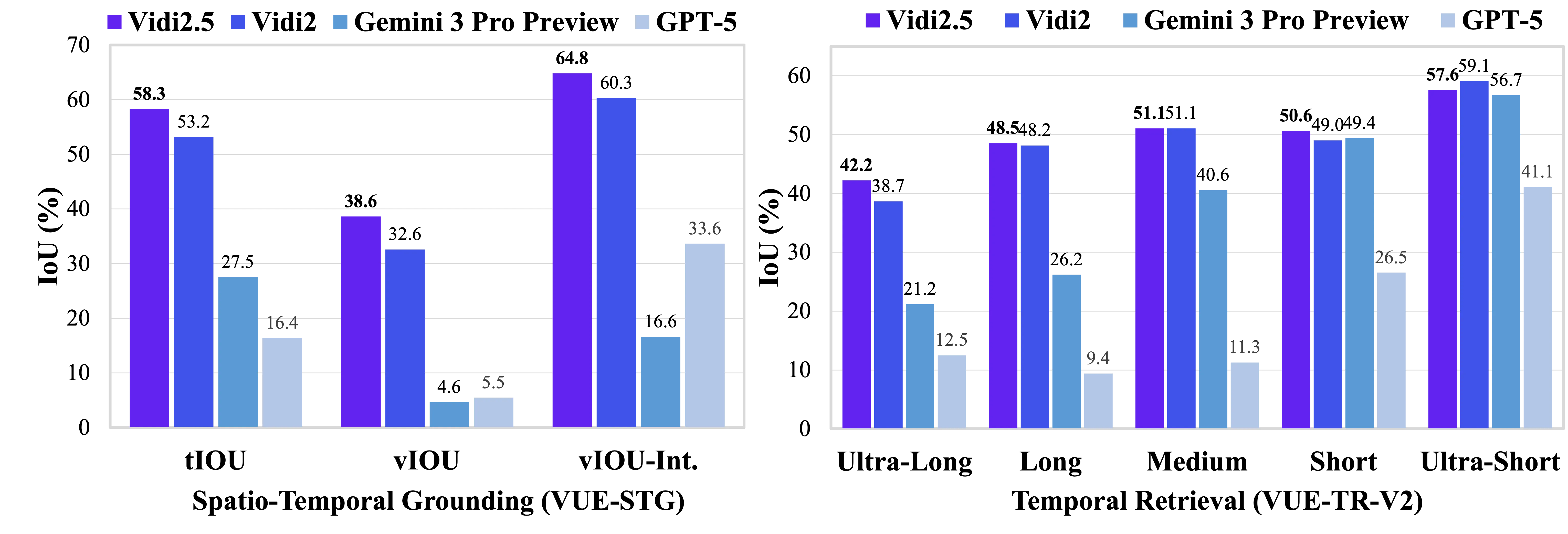 | Reported Results | Stronger STG; slightly better TR and Video QA than Vidi2; strong plot understanding in Vidi2.5-Think |